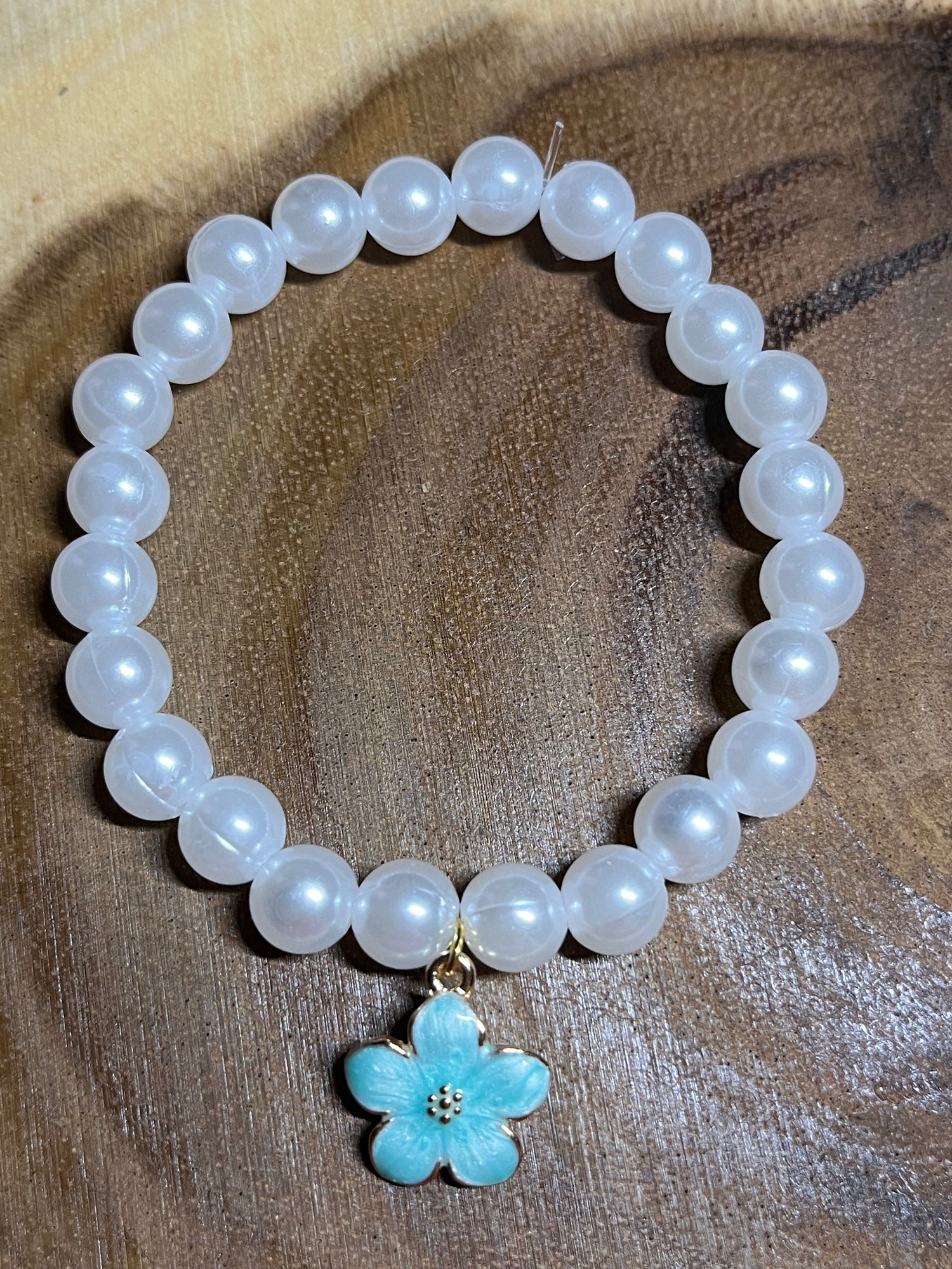 Check out are many different pearl bracelets with different flower charms.